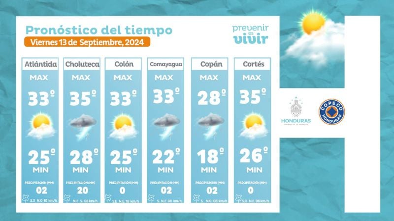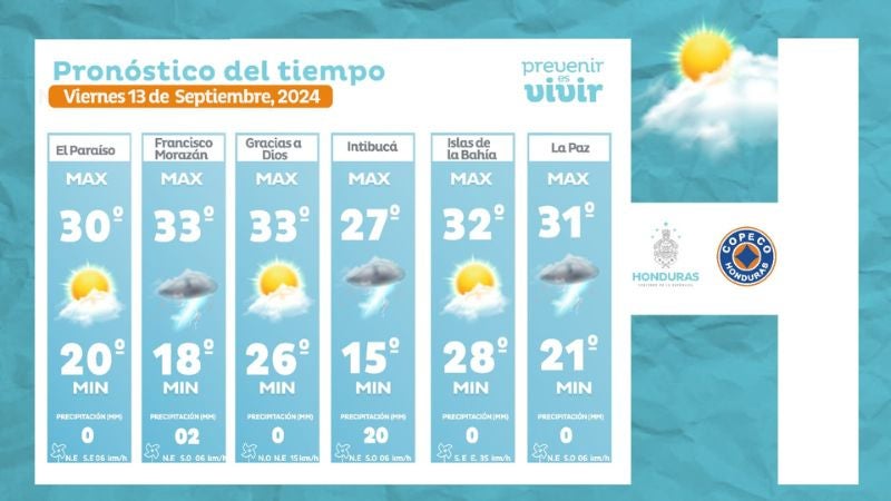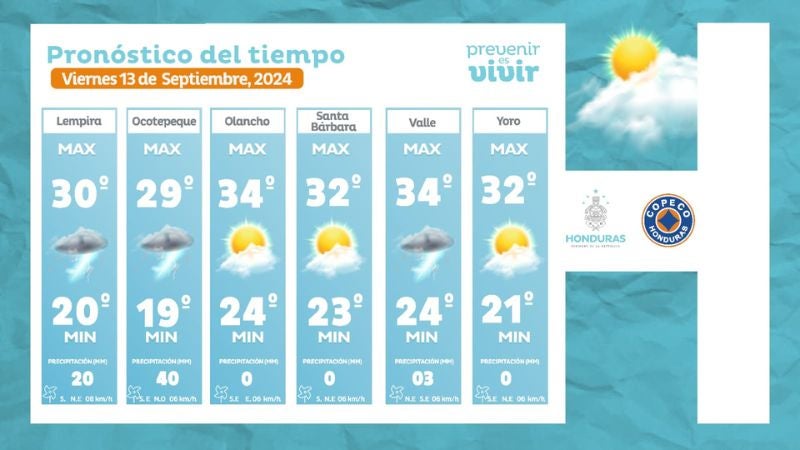- Olancho: 34° como máxima, 24° como mínima (0 milímetros).