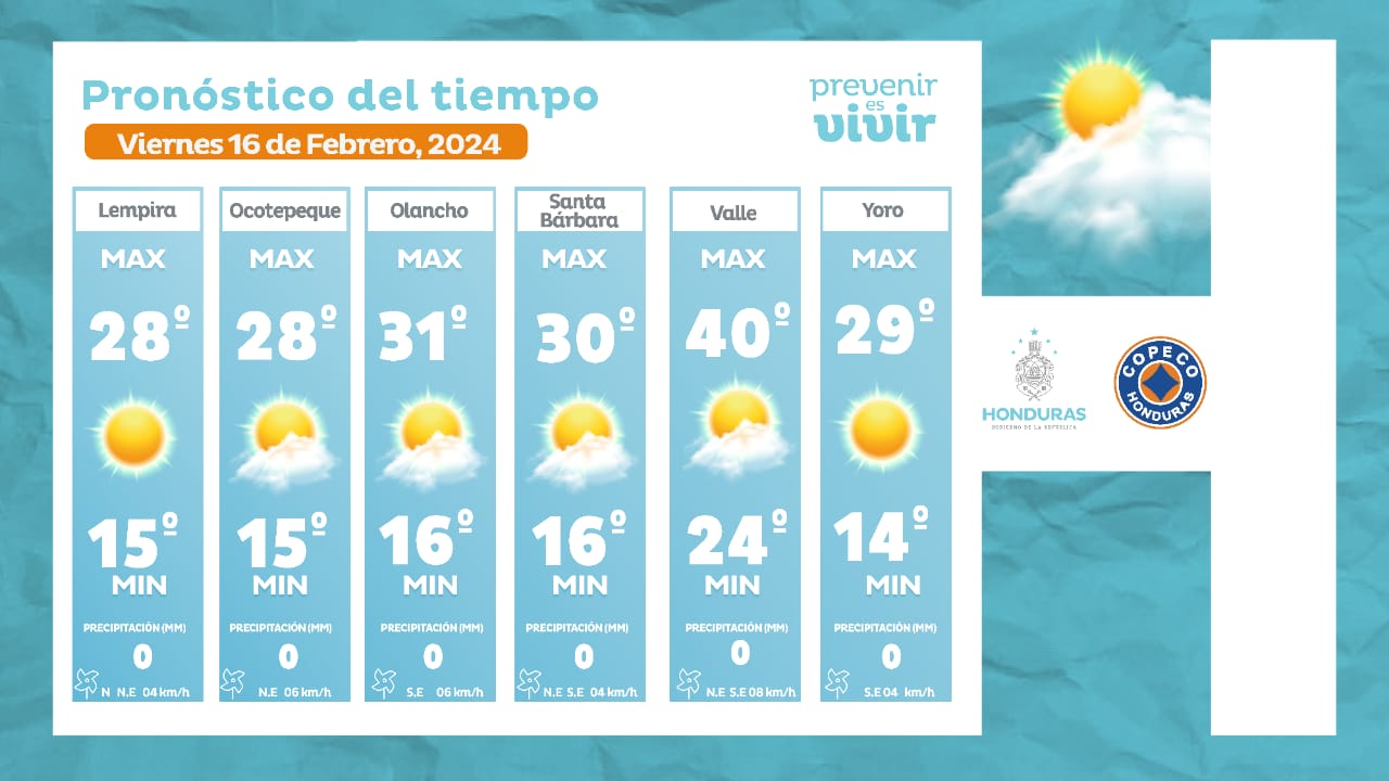- Olancho: 31° como máxima, 16° como mínima (0 milímetros).