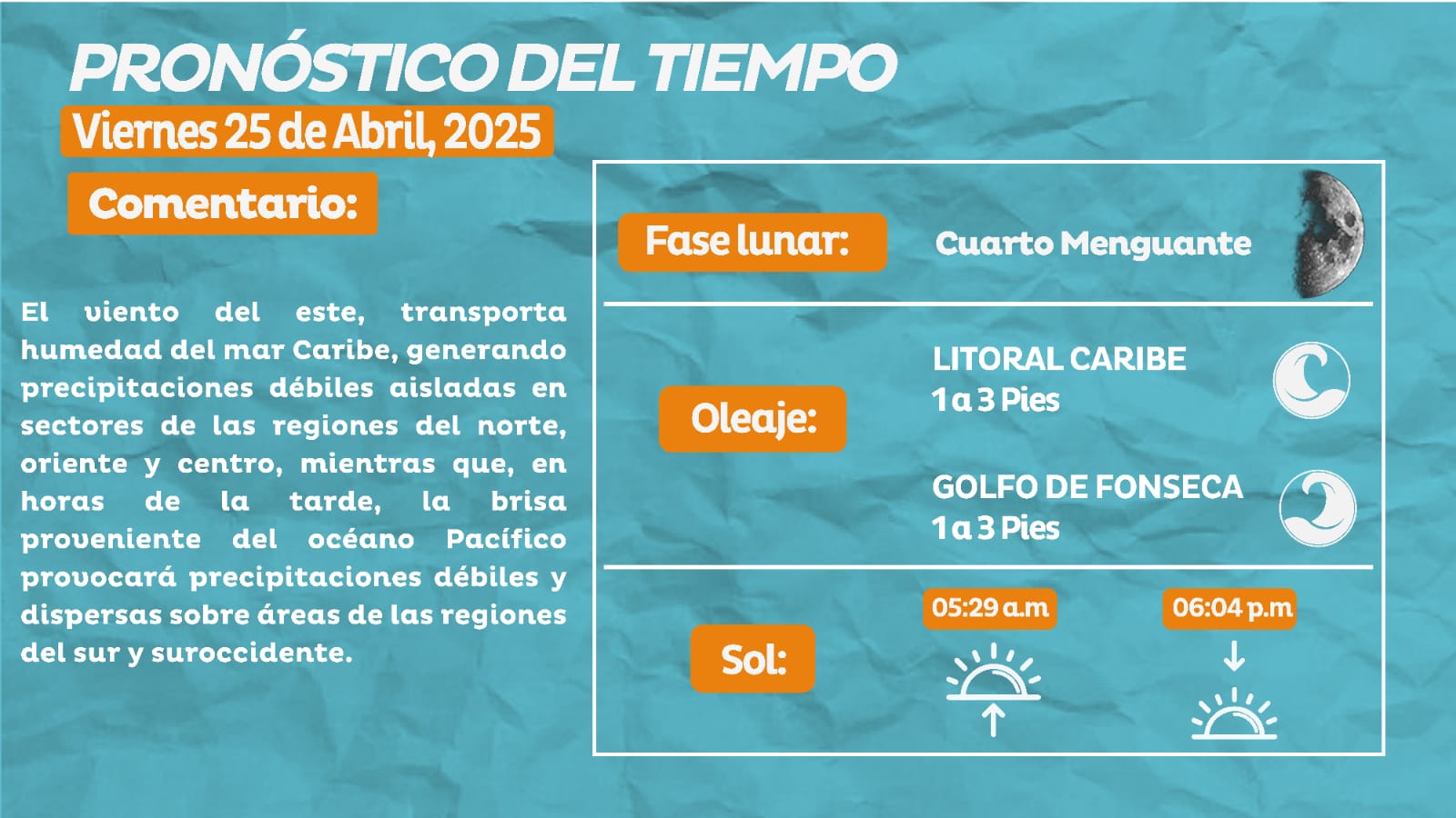 Clima. El Centro Nacional de Estudios Atmosféricos, Oceanográficos y Sísmicos (Cenaos) dio a conocer el pronóstico del clima para este viernes 25 de abril.
