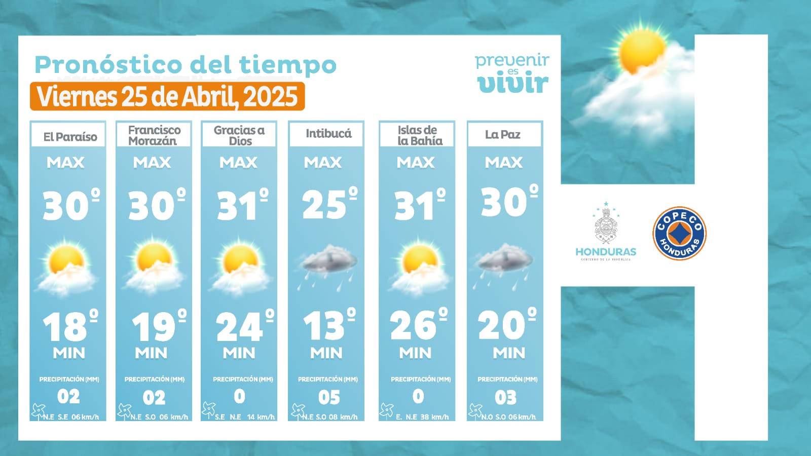 - La Ceiba: 30° como máximo, 23° como mínima (02 milímetros).
