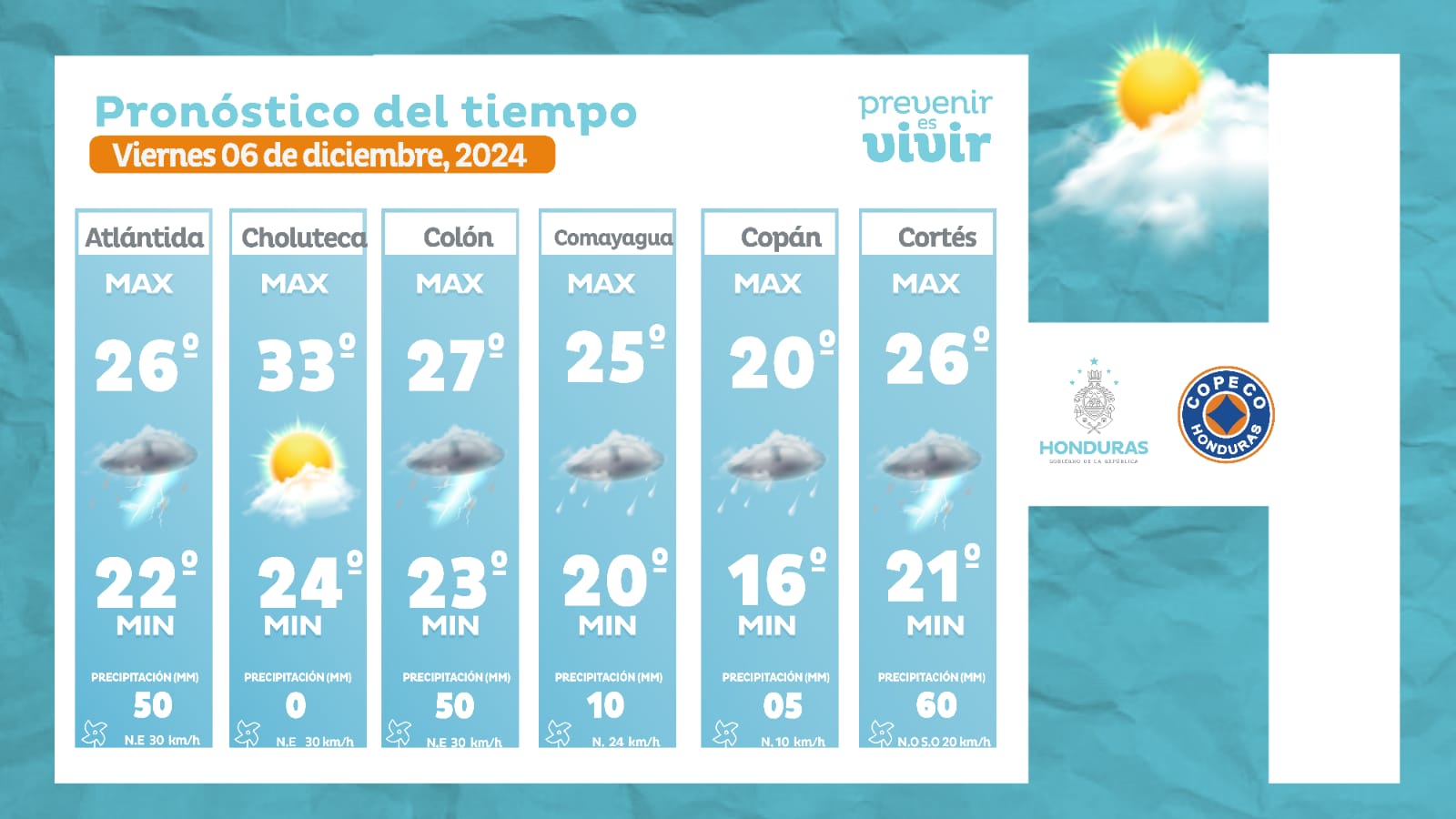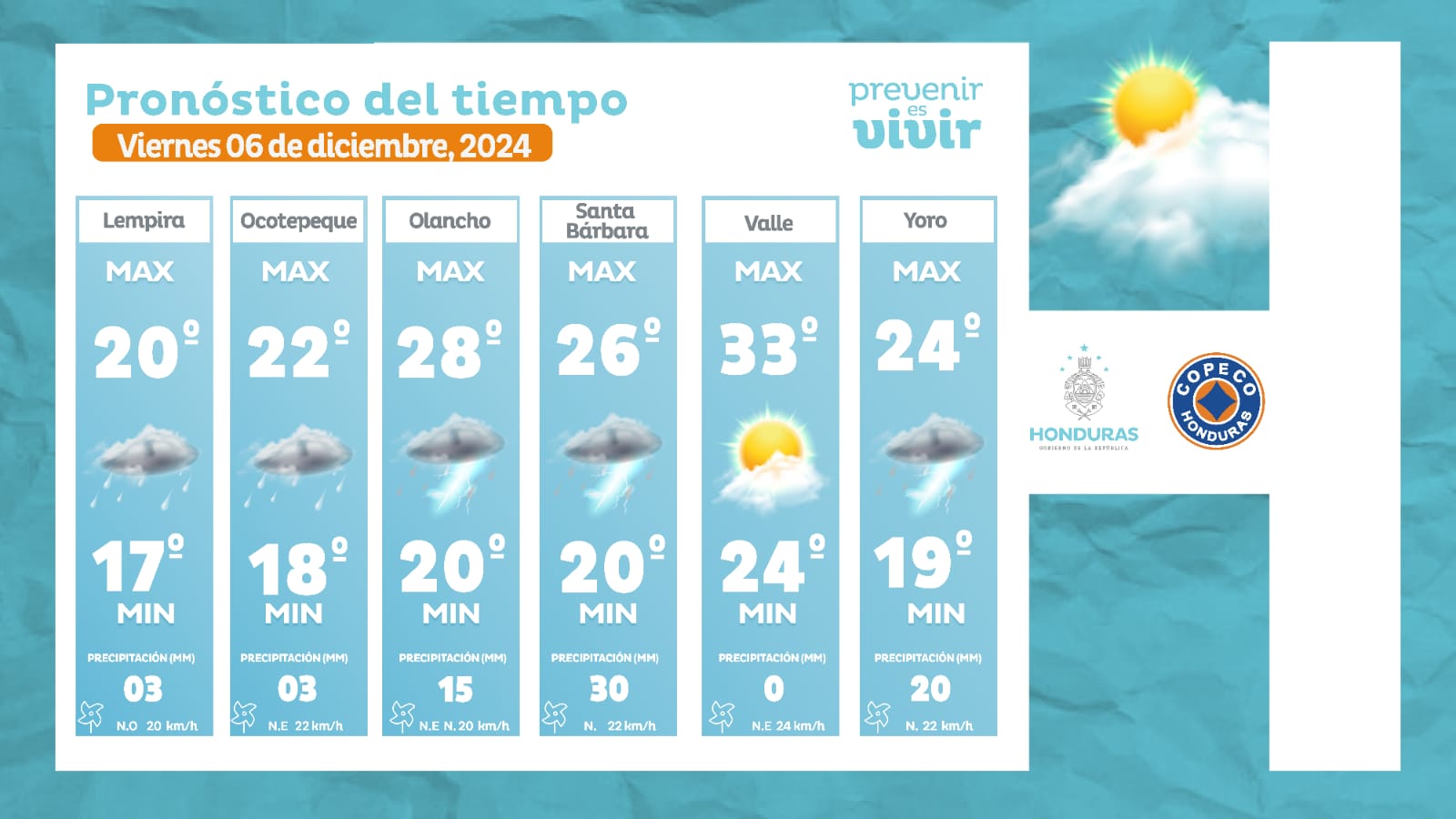 Honduras. Las autoridades del Centro de Estudios Atmosféricos, Oceanográficos y Sismológicos (Cenaos) informaron que hoy viernes, 6 de diciembre, continuarán las lluvias y el descenso de temperaturas en Honduras.