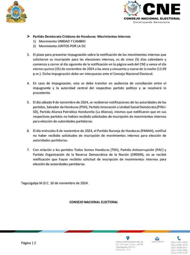 De igual forma, el Partido Naranja de Honduras (PANAH) informó el 6 de noviembre de 2024 que no ha recibido solicitudes de inscripción.