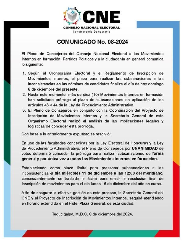 Redacción. El Consejo Nacional Electoral (CNE) anunció que, por unanimidad, ha decidido conceder una prórroga para que los movimientos internos en formación puedan subsanar inconsistencias en sus nóminas de candidatos en contienda electoral en marzo de 2025.