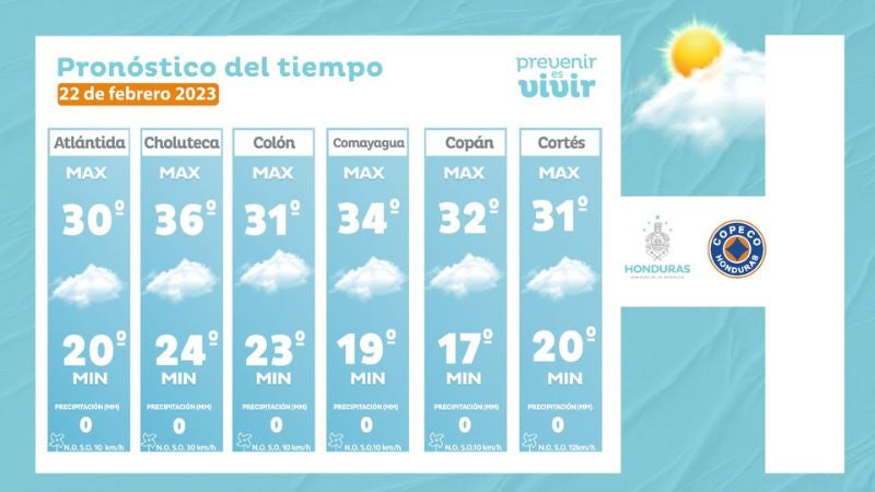 - Comayagua: 34° como máximo, 19° como mínimas (0 milímetros)