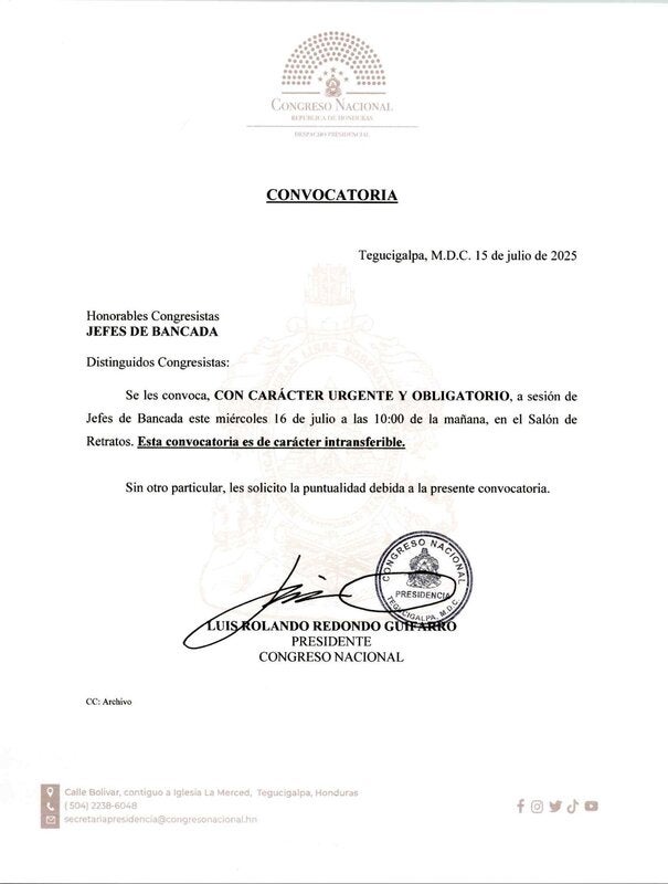 «Se les convoca con carácter urgente y obligatorio a sesión de jefes de bancada este miércoles 16 de julio a las 10:00 de la mañana en el Salón de Retratos. Esta convocatoria es de carácter intransferible. Sin otro particular, les solicito la puntualidad debida a la presente convocatoria», reza el escrito.