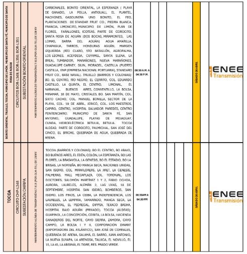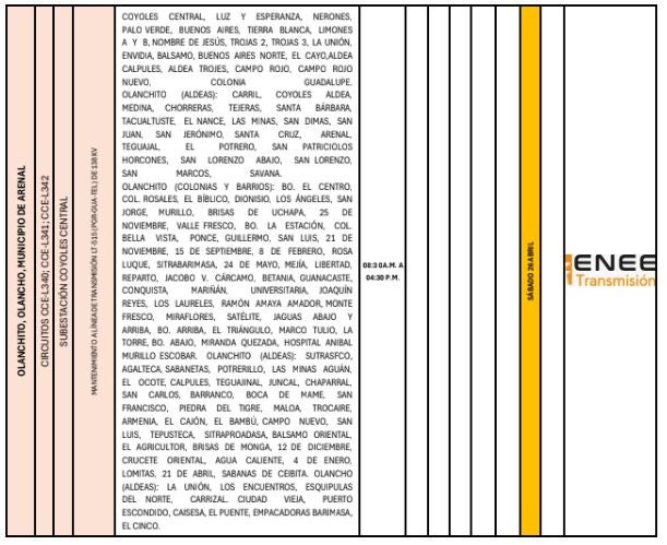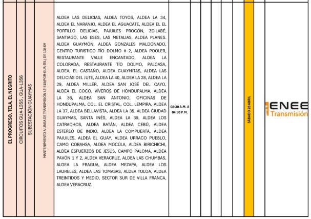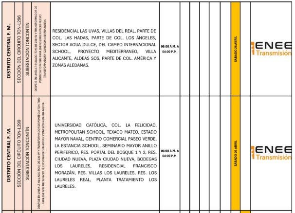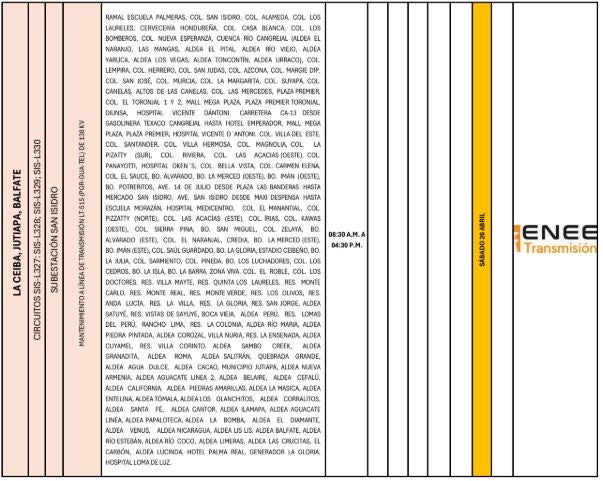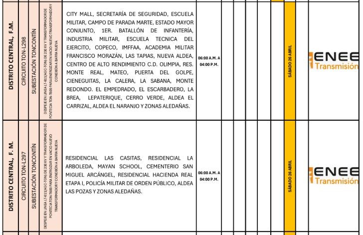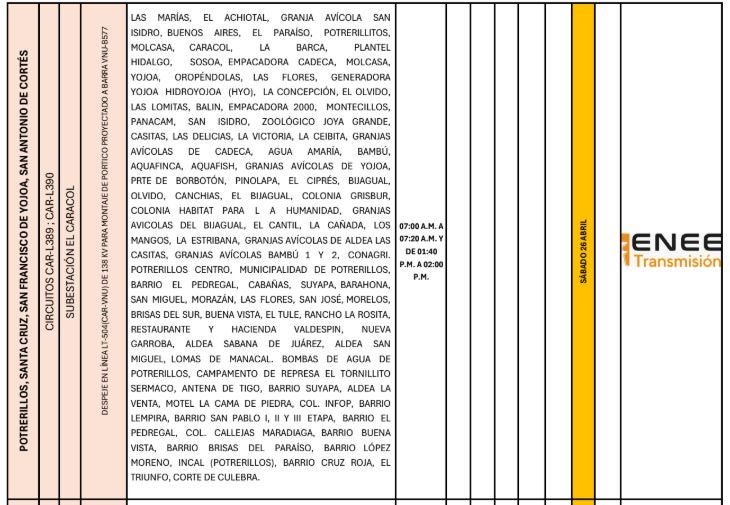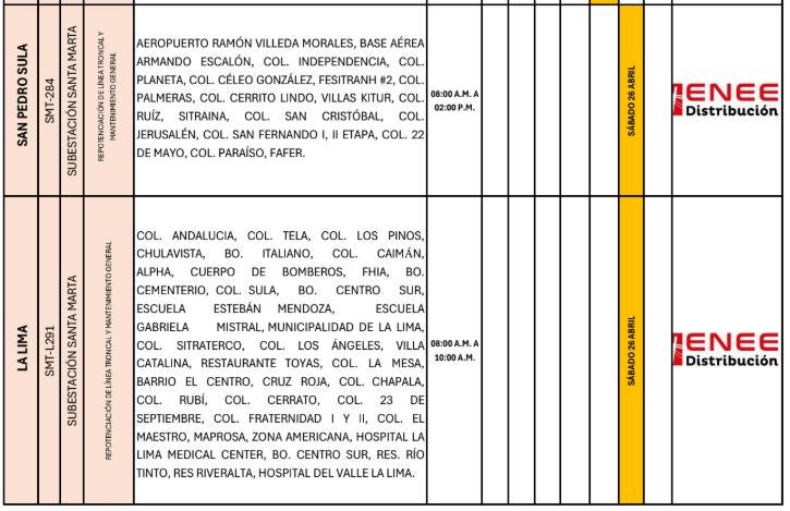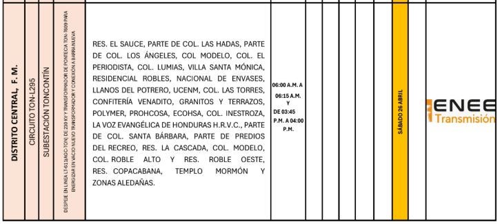 Redacción. Varias zonas de los departamentos de Francisco Morazán, Cortés, Atlántida, Colón y Yoro serán afectadas con los cortes de energía programados por la Empresa Nacional de Energía Eléctrica (ENEE) para este sábado 26 de abril de 2025.