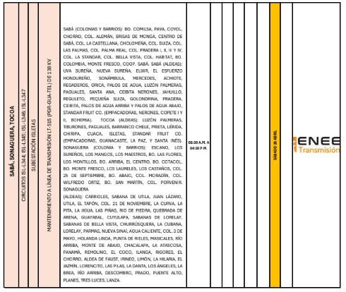 Además, se registrarán interrupciones en Villanueva, La Lima, San Pedro Sula, Potrerillos y San Antonio (Cortes), debido a trabajos en el circuito eléctrico y reparaciones varias. Las cuadrillas de técnicos estarán laborando entre las 8:0 a. m. a 4:00 p. m.