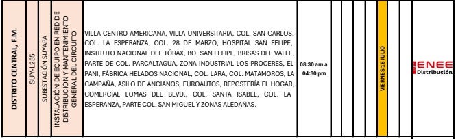 Redacción. La Empresa Nacional de Energía Eléctrica (ENEE) informó, a través de sus canales oficiales, que este viernes 18 de julio se llevarán a cabo cortes de energía eléctrica programados en distintas zonas del territorio nacional.