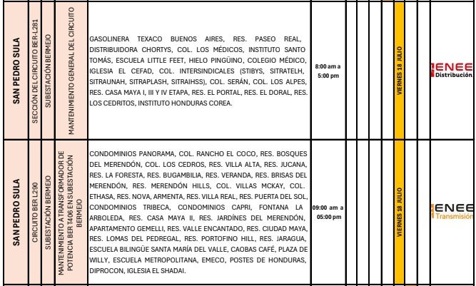 En San Pedro Sula, departamento de Cortés, los cortes están divididos en dos horarios. Algunas zonas no contarán con energía entre las 8:00 a. m. y las 5:00 p. m., mientras que en otras áreas la interrupción será de 9:00 de la mañana a 5:00 de la tarde.