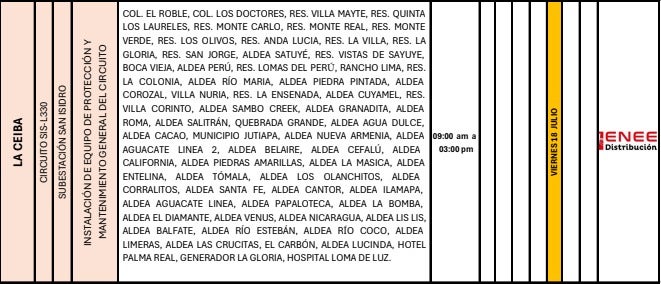 Por su parte, en La Ceiba, Atlántida, el servicio eléctrico será suspendido desde las 9:00 am hasta las 3:00 pm. La ENEE exhortó a los usuarios a mantenerse atentos a los canales oficiales para conocer detalles adicionales sobre las futuras interrupciones.