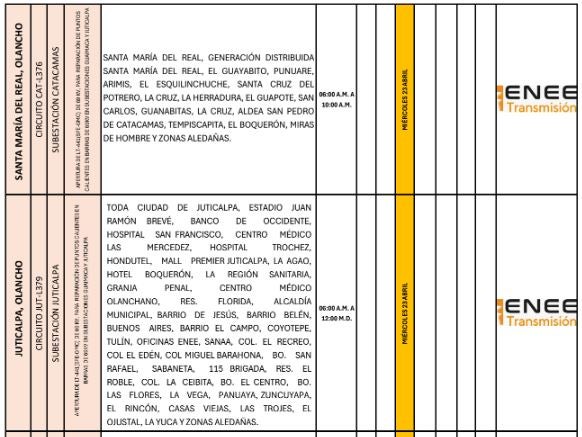 Redacción. Varias zonas del departamento de Olancho, Cortés y Francisco Morazán serán afectadas con los cortes de energía programados por la Empresa Nacional de Energía Eléctrica (ENEE) para este miércoles 23 de abril de 2025.