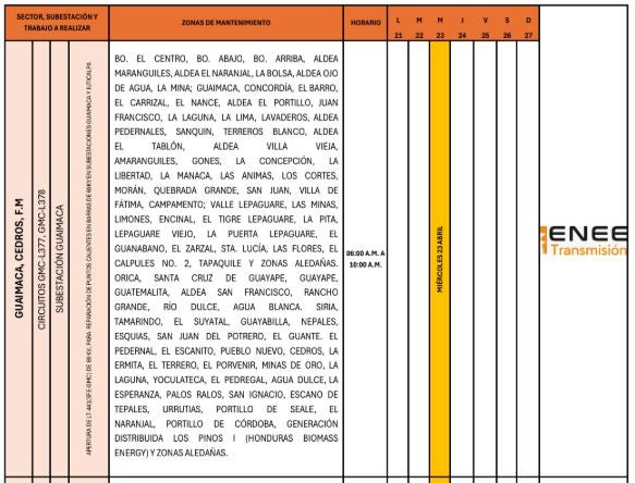 Finalmente, en Guaimaca, Cedros (Francisco Morazán), habrá trabajos de mantenimiento de 6:00 de la mañana a 10:00 de la mañana.