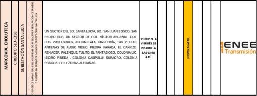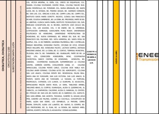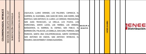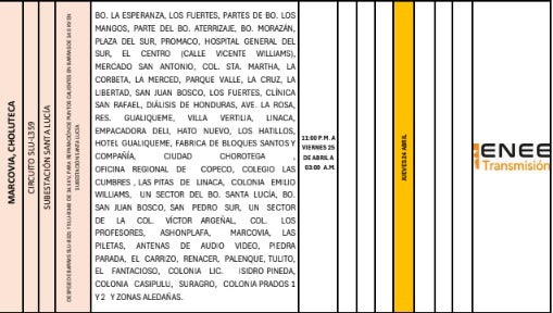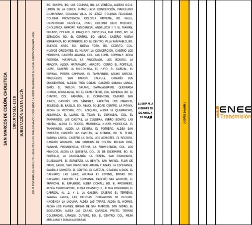 Por otro lado, en Choluteca, los sectores de Las Colinas, La Rinconada y La Venencia experimentarán una suspensión del suministro eléctrico entre las 11:00 p. m. y las 3:00 a. m. del viernes 25 de abril.