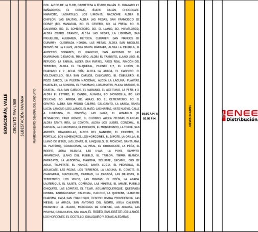 En el departamento de Valle, los residentes de las colonias Los Limones, Altos de la Flor y aldea Las Vegas se verán afectados por un corte de luz, que se extenderá desde las 8:00 a. m. hasta las 2:00 p. m. En Intibucá, el servicio será interrumpido desde las 6:15 a. m. hasta las 2:15 p. m.