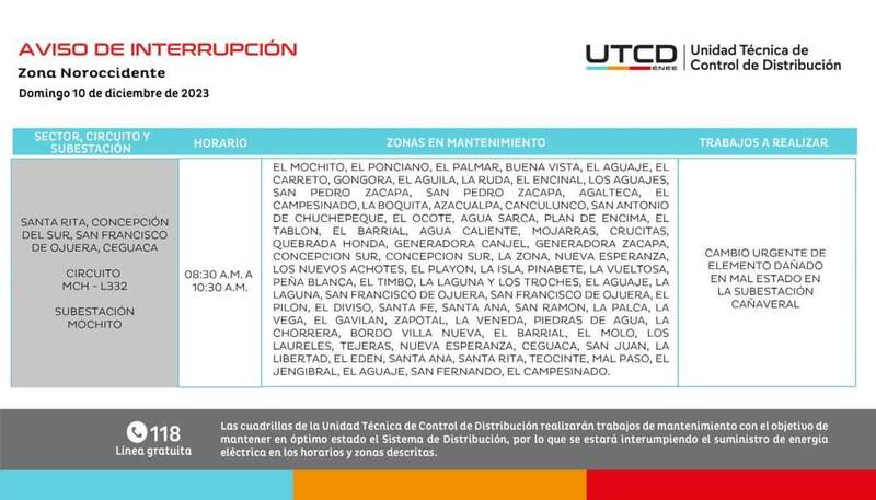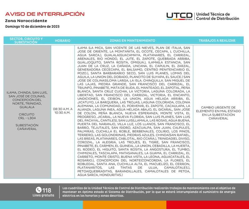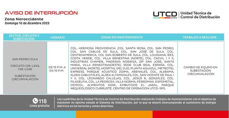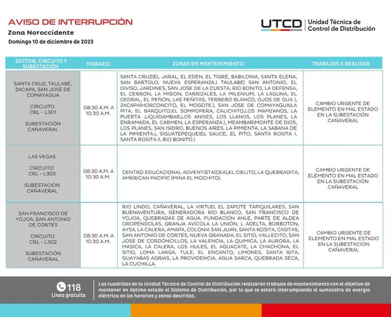 Redacción. La Empresa Nacional de Energía Eléctrica (ENEE) informó que este domingo 10 de diciembre, Comayagua y Cortés son parte de las zonas donde se registrarán cortes de luz.