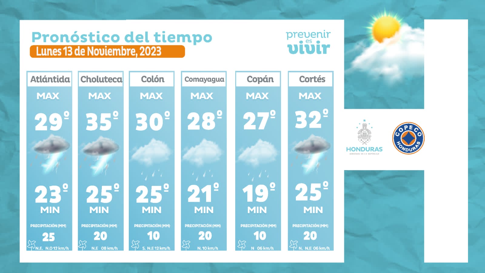 - La Ceiba: 29° como máximo, 23° como mínimas (25 milímetros)