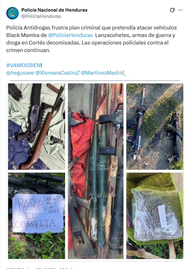 “Estos artefactos de guerra iban a ser utilizados para derribar los Black Mamba”, señaló, advirtiendo sobre la gravedad de las intenciones de estos grupos criminales.