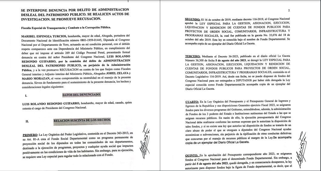 Tegucigalpa, Honduras. La diputada del Partido Salvador de Honduras (PSH), Maribel Espinoza, presentó este viernes ante el Ministerio Público (MP) una denuncia en contra del presidente del Congreso Nacional, Luis Redondo, por el delito de administración desleal del patrimonio público.