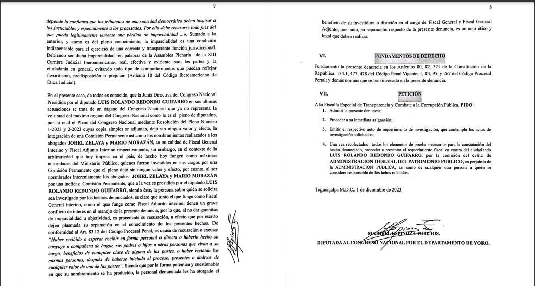 En el documento presentado, la congresista también promueve la recusación en contra de Johel Zelaya y Mario Zelaya, quienes fungen como fiscal general interino y adjunto del Ministerio Público.