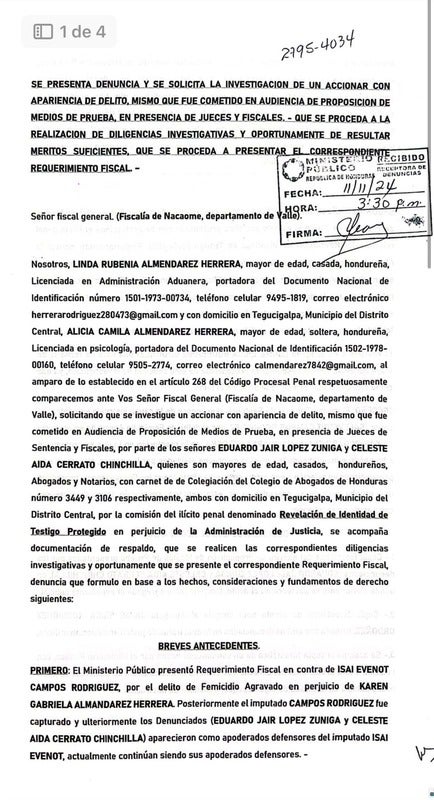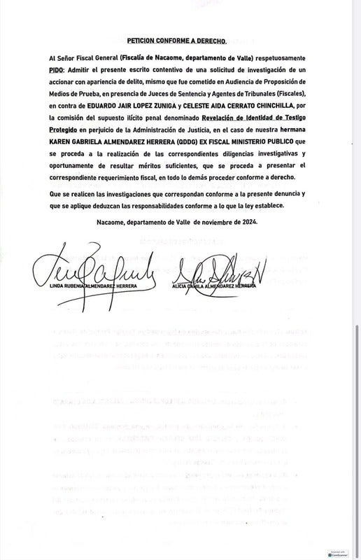 De acuerdo al documento, la hermana de la exfiscal Karen Almendarez, Linda Rubenia Almendarez, presentó la denuncia el 11 de noviembre del año presente.