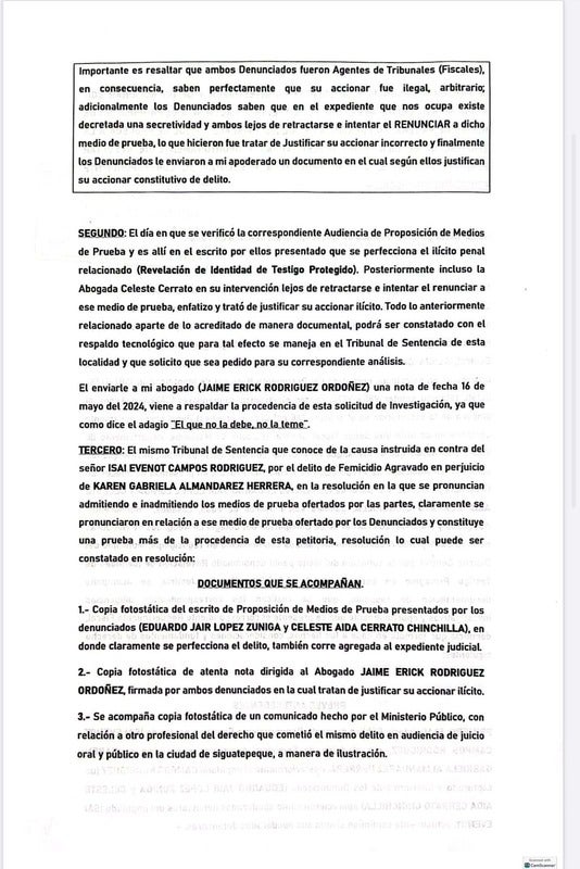 En este sentido, la denuncia solicitó al Ministerio Público (MP) una investigación exhaustiva en contra de Eduardo Jair Lopez Zúniga y Celeste Aida Cerrato Chinchilla ante la presunta revelación de identidad de un testigo protegido.