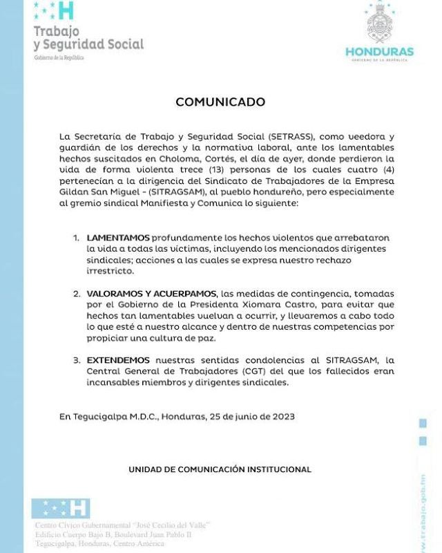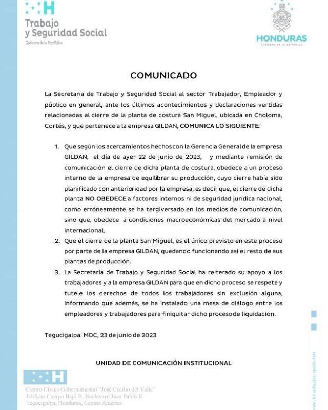 El pasado junio, la propia Secretaría de Trabajo se refirió al tema del cierre de la planta Gildan San Miguel. En un comunicado explicaron que se debía a las condiciones macroeconómicas del mercado internacional.