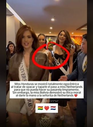 En el clip publicado en la plataforma de TikTok, a la hondureña se le señaló de «soberbia» y «egocéntrica» después de, aparentemente, querer opacar y obstruirle el paso a Miss Países Bajos, Faith Genevieve Landman, de 28 años, durante una pasarela.