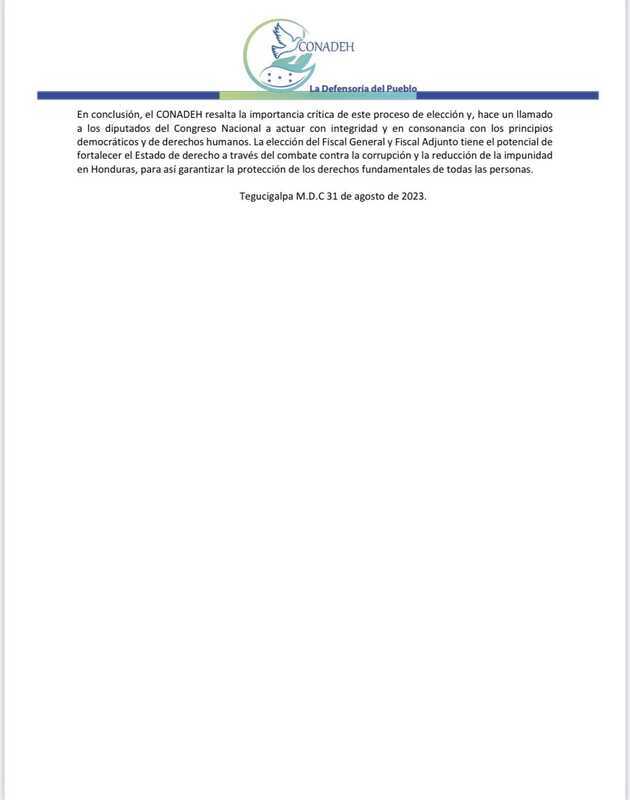 «La elección del fiscal general y fiscal adjunto tiene potencial de fortalecer el Estado de derecho a través del combate contra la corrupción y la reducción de la impunidad en Honduras», cita el pronunciamiento.