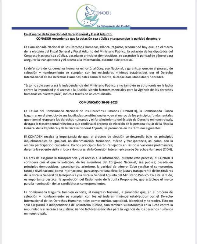 Por su parte, Izaguirre también exhortó al Congreso Nacional garantizar que el proceso de selección y nombramiento se cumpla con los estándares establecidos por el Derecho Internacional de los DDHH.
