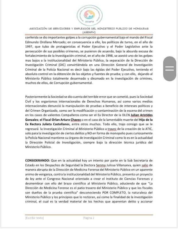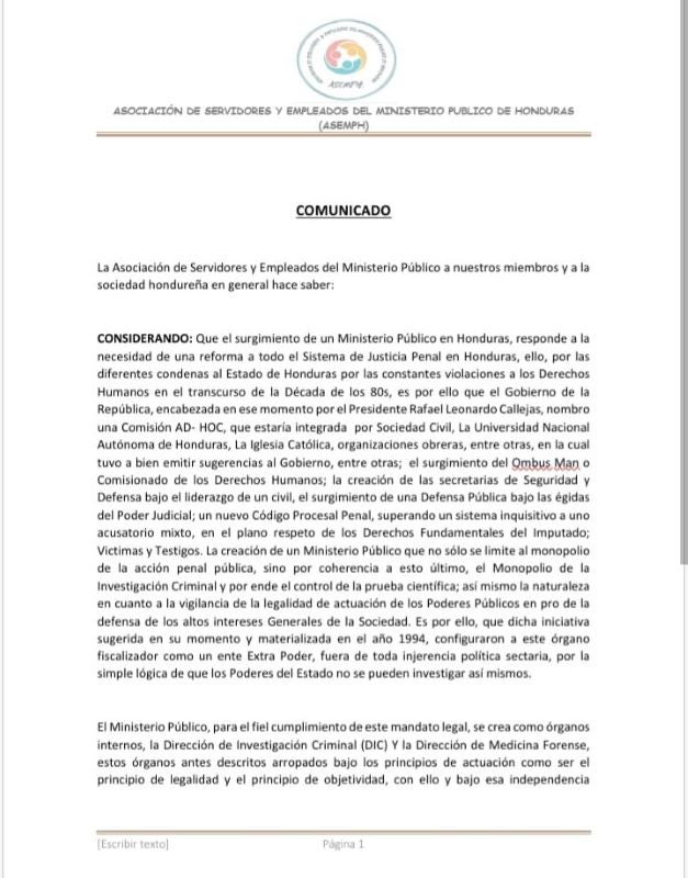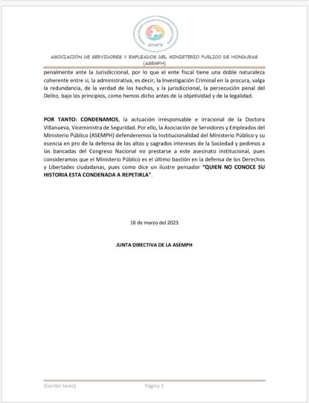 “Condenamos la actuación irresponsable e irracional de la Doctora Villanueva, Viceministra de Seguridad. Por ello, la Asociación de Servidores y Empleados del Ministerio Público (ASEMPH) defenderemos la Institucionalidad del Ministerio Público», afirman en el comunicado.