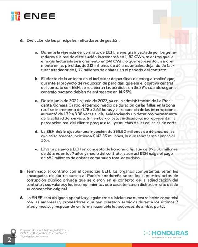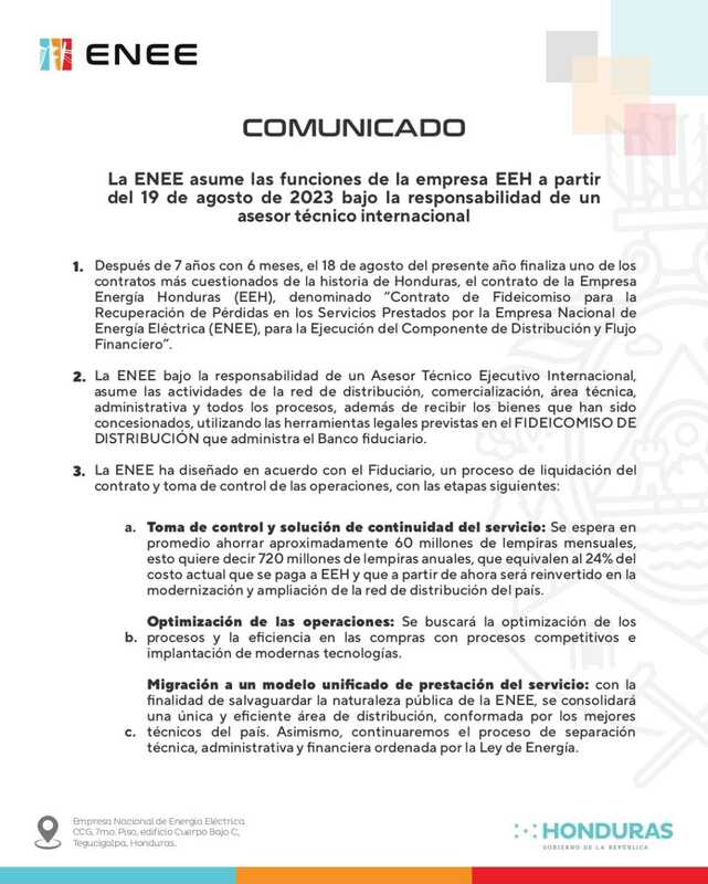 «La ENEE, bajo la responsabilidad de un asesor técnico ejecutivo internacional, asume las actividades de la red de distribución, comercialización, área técnica, administrativa y todos los procesos, además de recibir los bienes que han sido concesionados, utilizando las herramientas legales previstas en el fideicomiso de distribución que administra el Banco fiduciario», informó.