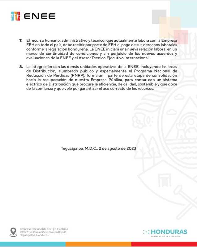 «La ENEE iniciará una nueva relación laboral en un marco de continuidad de condiciones y sin perjuicio de los nuevos acuerdos y evaluaciones de la ENEE», apuntó.