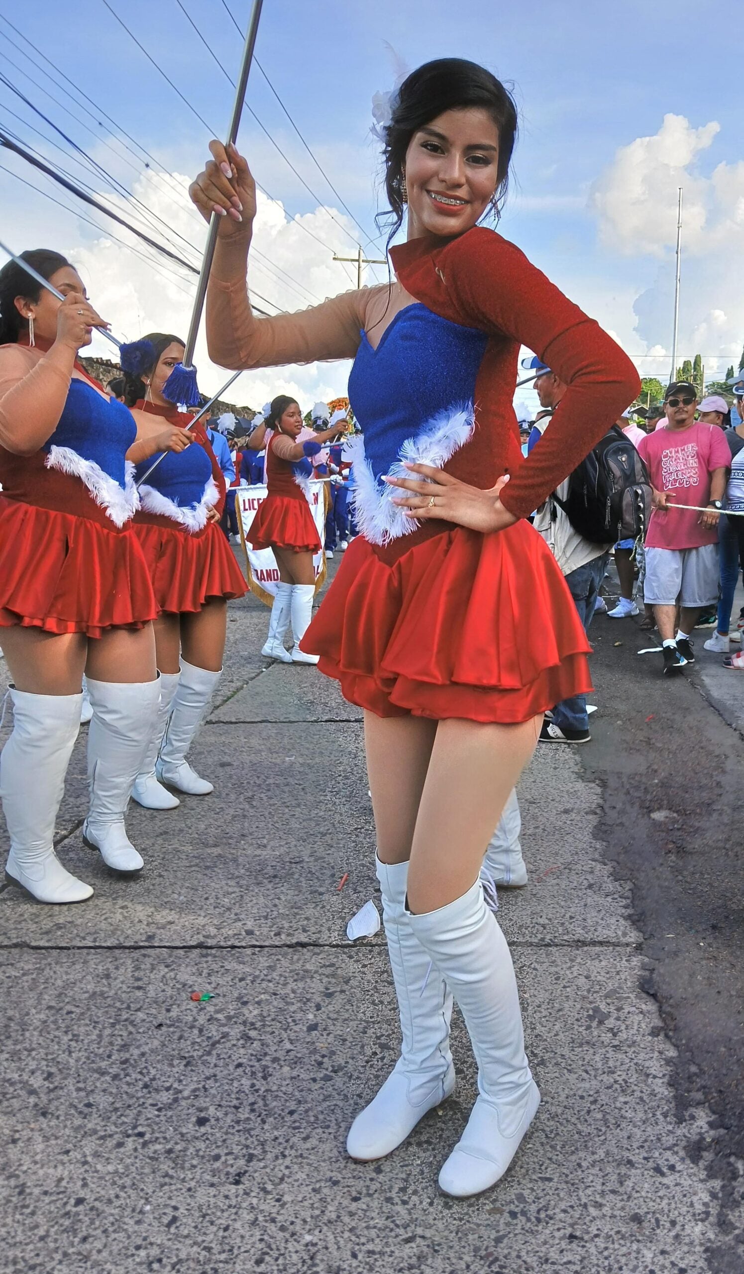 El cuadro de palillonas optó por una vestimenta color azul, blanco y rojo, acompañado de unas botas color blanco. La combinación de los tres colores las hicieron lucir bellas y encantadoras. Además, adornaron ambas puntas de las batutas con detalles color azul marino.