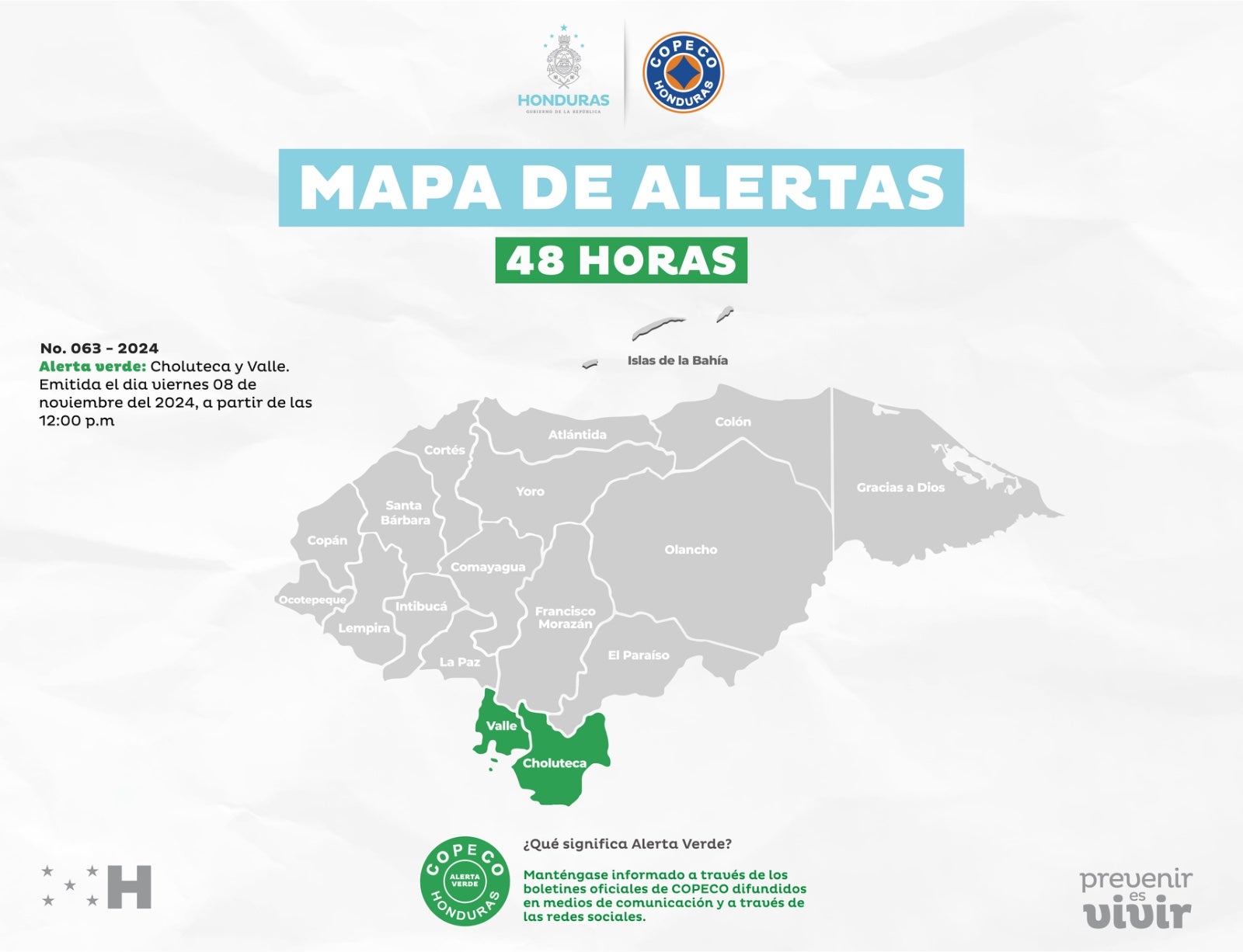 Redacción. La Secretaría de Estado en los Despachos de Gestión de Riesgos y Contingencias Nacionales (Copeco) extendió la alerta verde para los departamentos de Choluteca y Valle.