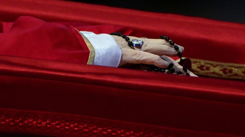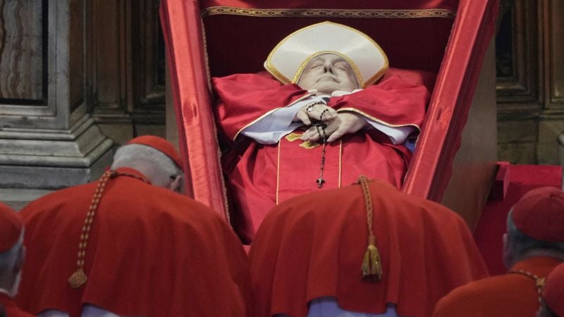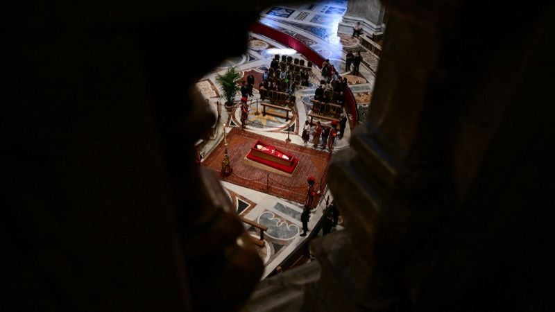 El ataúd con los restos mortales de Jorge Mario Bergoglio se instaló, abierto, ante el imponente baldaquino barroco de la basílica, con su inseparable rosario entre las manos y casulla roja.