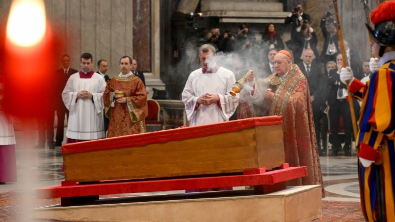 El féretro de madera abierto lo llevaron en procesión desde la capilla de Santa Marta, donde falleció el lunes a los 88 años. Dicho acto estuvo acompañado de cardenales y guardias suizos.