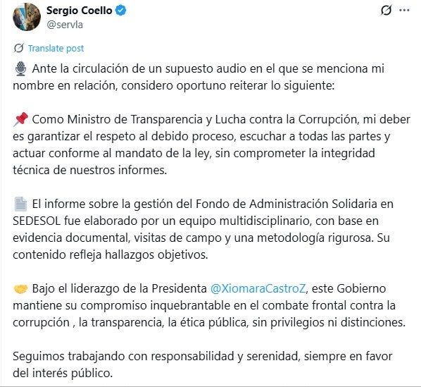 Tras la filtración, el ministro de Transparencia reaccionó en la red social X sin referirse directamente al contenido del audio. Señaló que su responsabilidad es “garantizar el debido proceso y actuar conforme a la ley”.