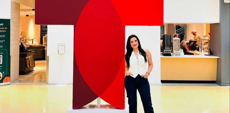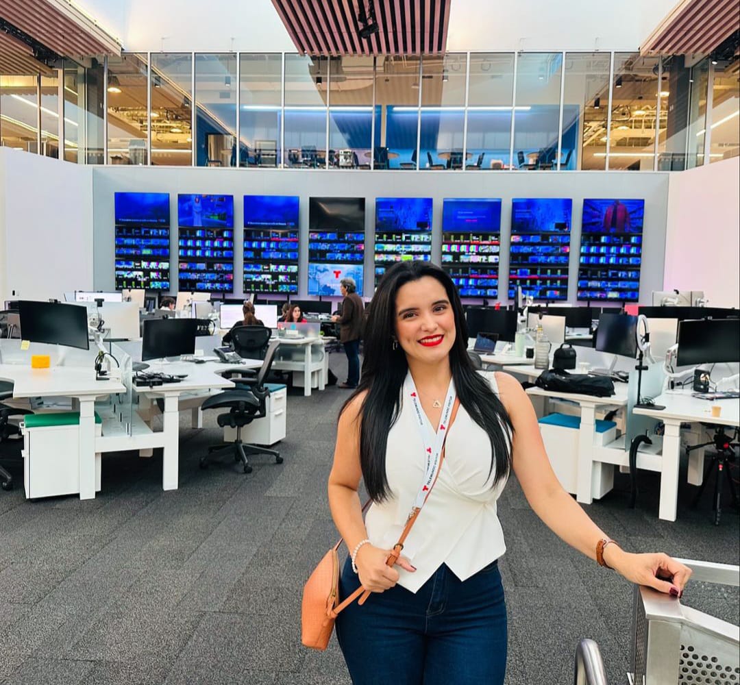 Llena de emoción y con un elegante traje, Orellana muestra en la fotografía parte de las instalaciones del prestigioso canal.