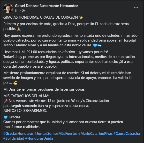 Según indicó, hasta la fecha se han recaudado L41,291.00. Pero todavía hay promesas de ayuda provenientes de medios de comunicación, hondureños en el extranjero y figuras políticas que ya han expresado su respaldo.