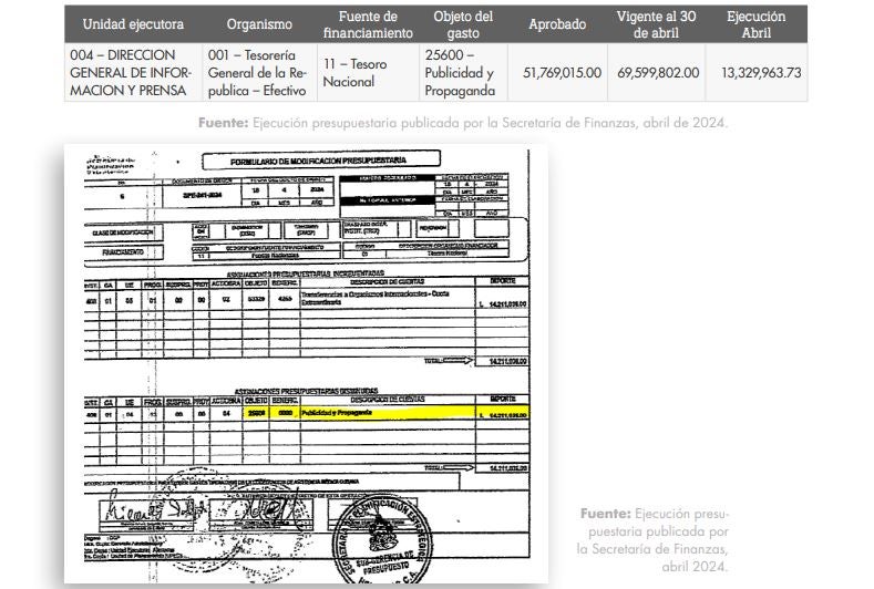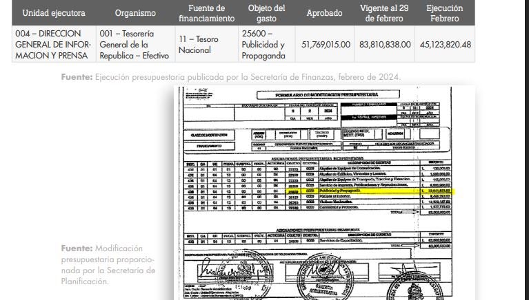 Esta cantidad fue financiada en su totalidad con recursos externos provenientes del préstamo No. 2297 del BCIE, fondos que, según el Consejo Nacional Anticorrupción (CNA), originalmente no estaban destinados para cubrir gastos de propaganda y publicidad.