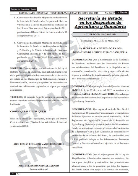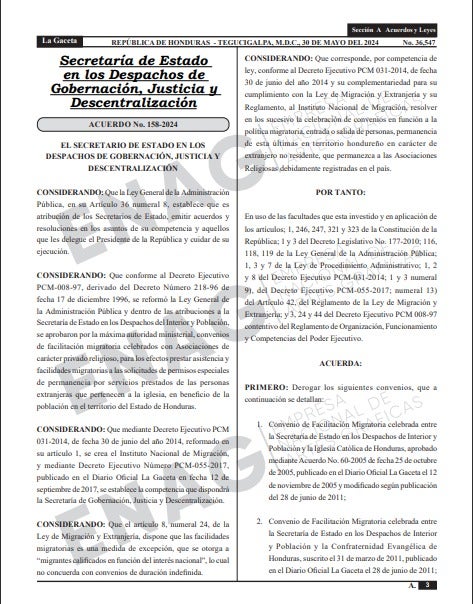 La administración de Xiomara Castro, a través de la Secretaría de Gobernación, Justicia y Descentralización, aprobó el acuerdo 158-2024 el 21 de febrero del 2024 y lo publicó 30 de mayo del presente año en La Gaceta, mediante el cual estableció derogar los «convenios de facilitación migratoria» celebrados con la Iglesia católica, la Confraternidad Evangélica de Honduras, la Iglesia de Jesucristo de los Últimos Días, conocidos popularmente como Los Mormones, y la Misión Adventista.