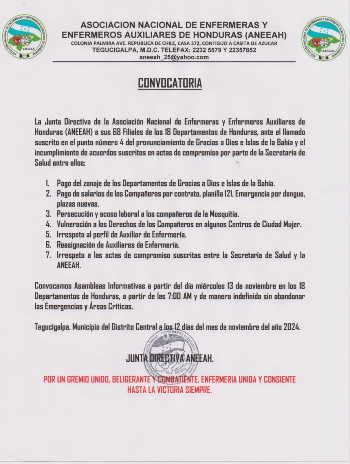 Tegucigalpa, Honduras. Josué Orellana, presidente de la Asociación Nacional de Enfermeras y Enfermeros Auxiliares de Honduras (ANEEAH), informó que mañana, miércoles, el gremio irá un paro de labores exigiendo el cumplimiento de sus peticiones y derechos.
