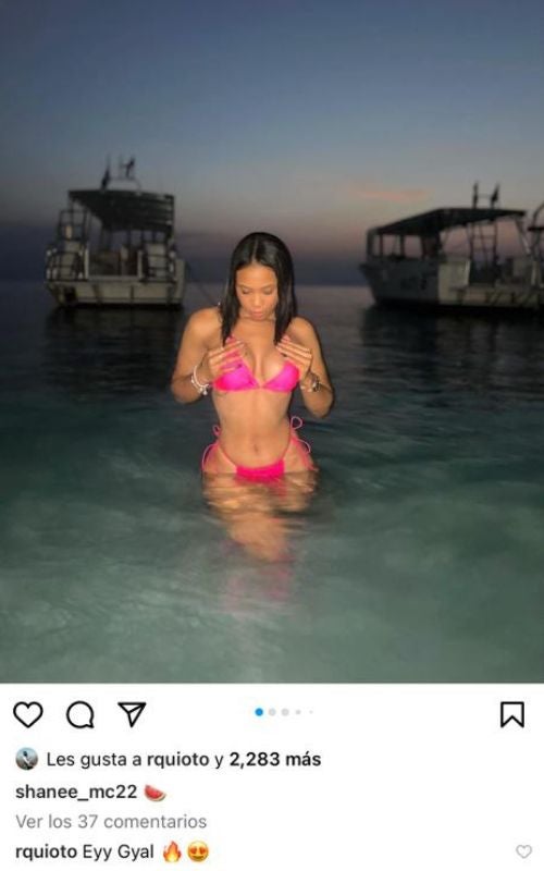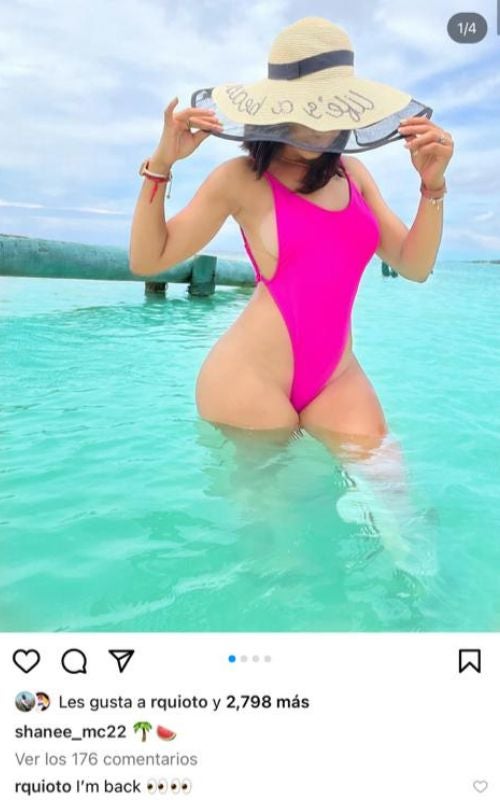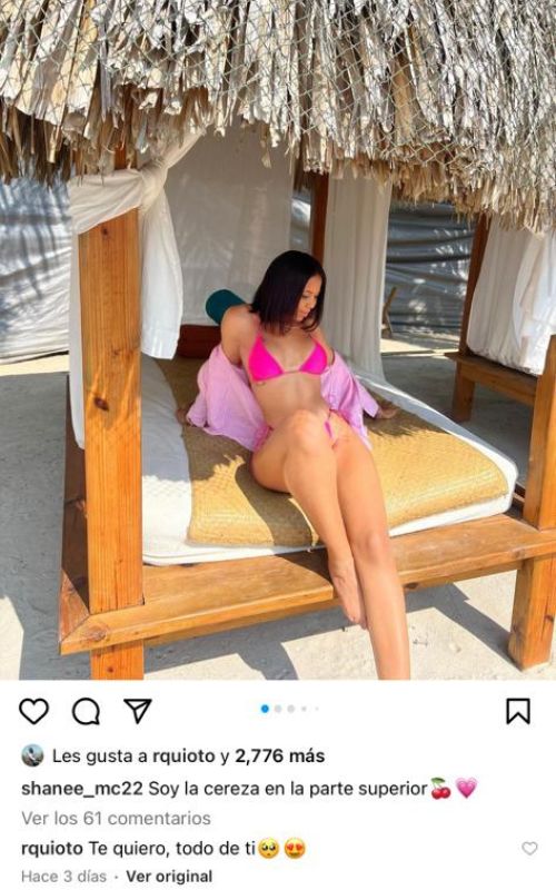 «He vuelto», le comentó Quioto a la foto de Shenee luciendo un atrevido traje de baño rosado de una pieza. Asimismo, en otra foto donde la chica vuelve a usar un traje de baño rosado, pero esta vez de dos piezas, el hondureño le comento: «Hola Gyal».