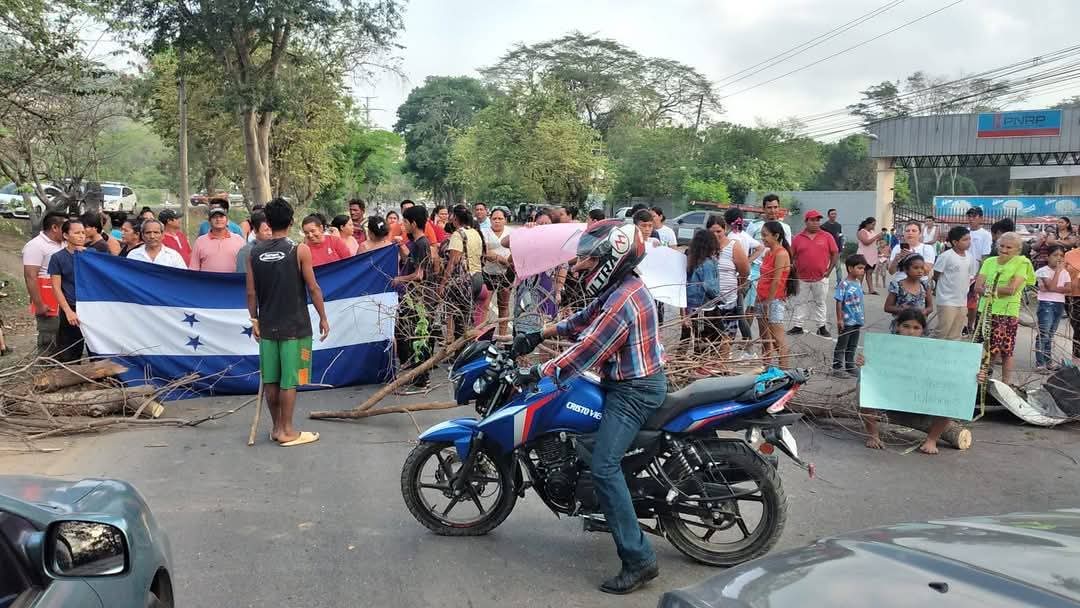 Villanueva, Cortés. Habitantes del complejo habitacional Anexos Tulipanes protestan esta mañana en la carretera CA-5, a la altura de Zip Buena Vista en Villanueva, Cortés.