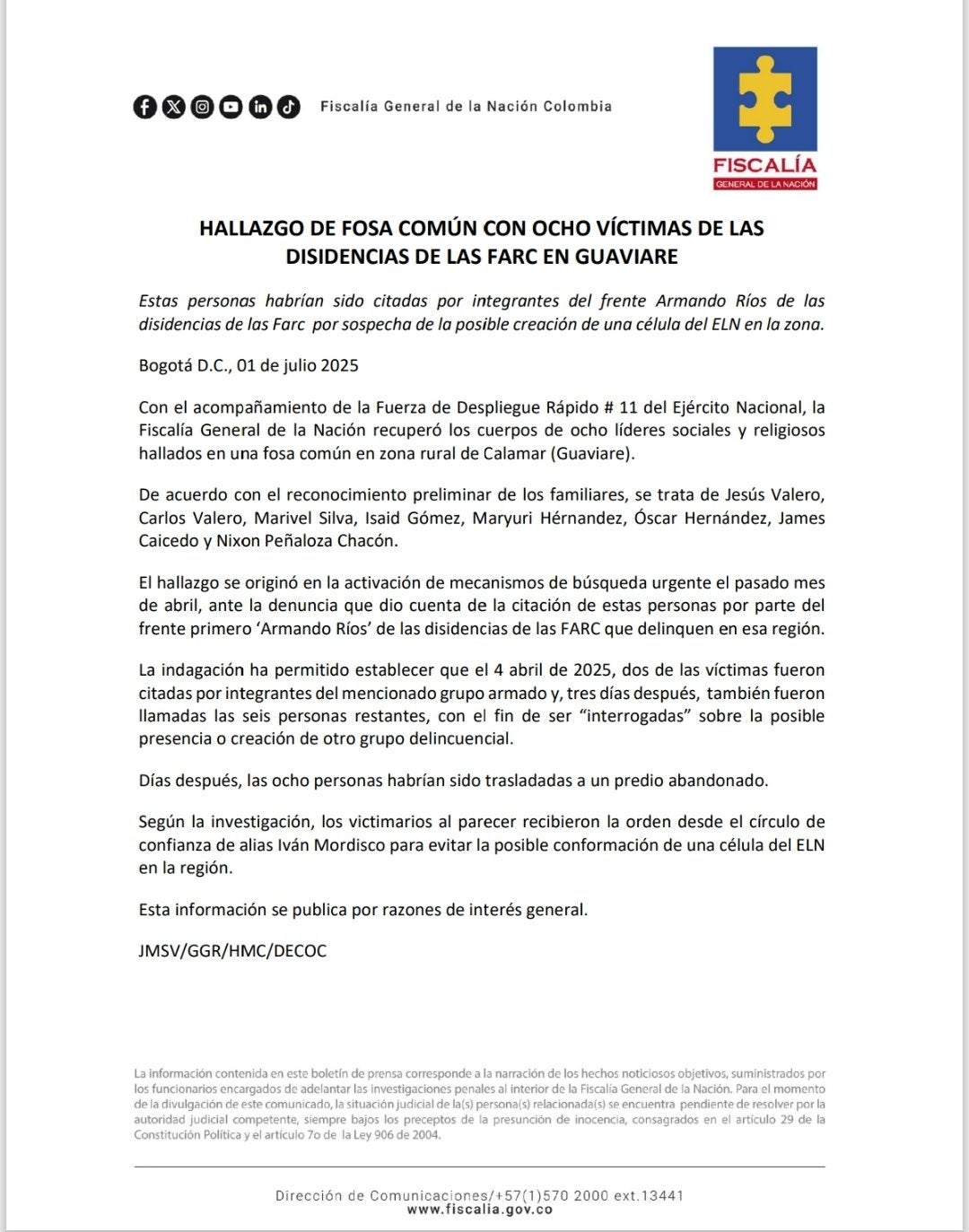 Asimismo, el comunicado cita que «los victimarios al parecer recibieron la orden (del asesinato) desde el círculo cercano de alias Iván Mordisco», el criminal más buscado del país.