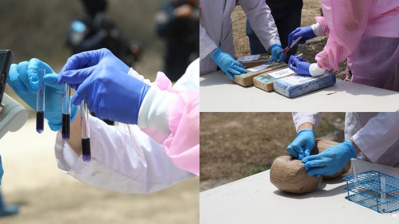 Asimismo, personal de Medicina Forense procedió con las pruebas de campo ( denominada Scott) en el sitio, y arrojaron tonalidad que da positivo a clorhidrato de cocaína y marihuana. Los paquetes de droga se acomodaron en fogatas, se les colocó leña, la cubrieron con gasolina y la encendieron en fuego para destruirlos en su totalidad.