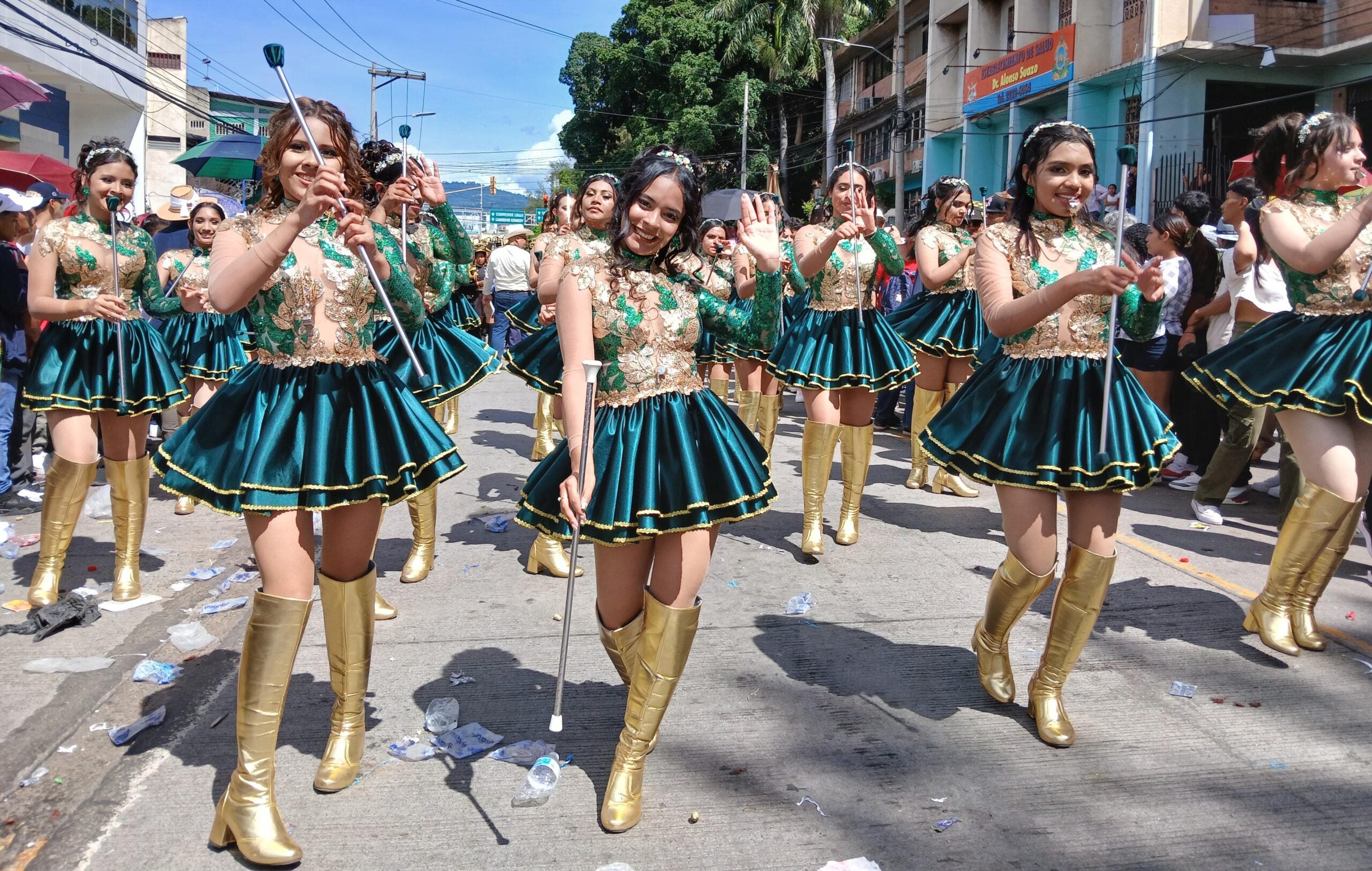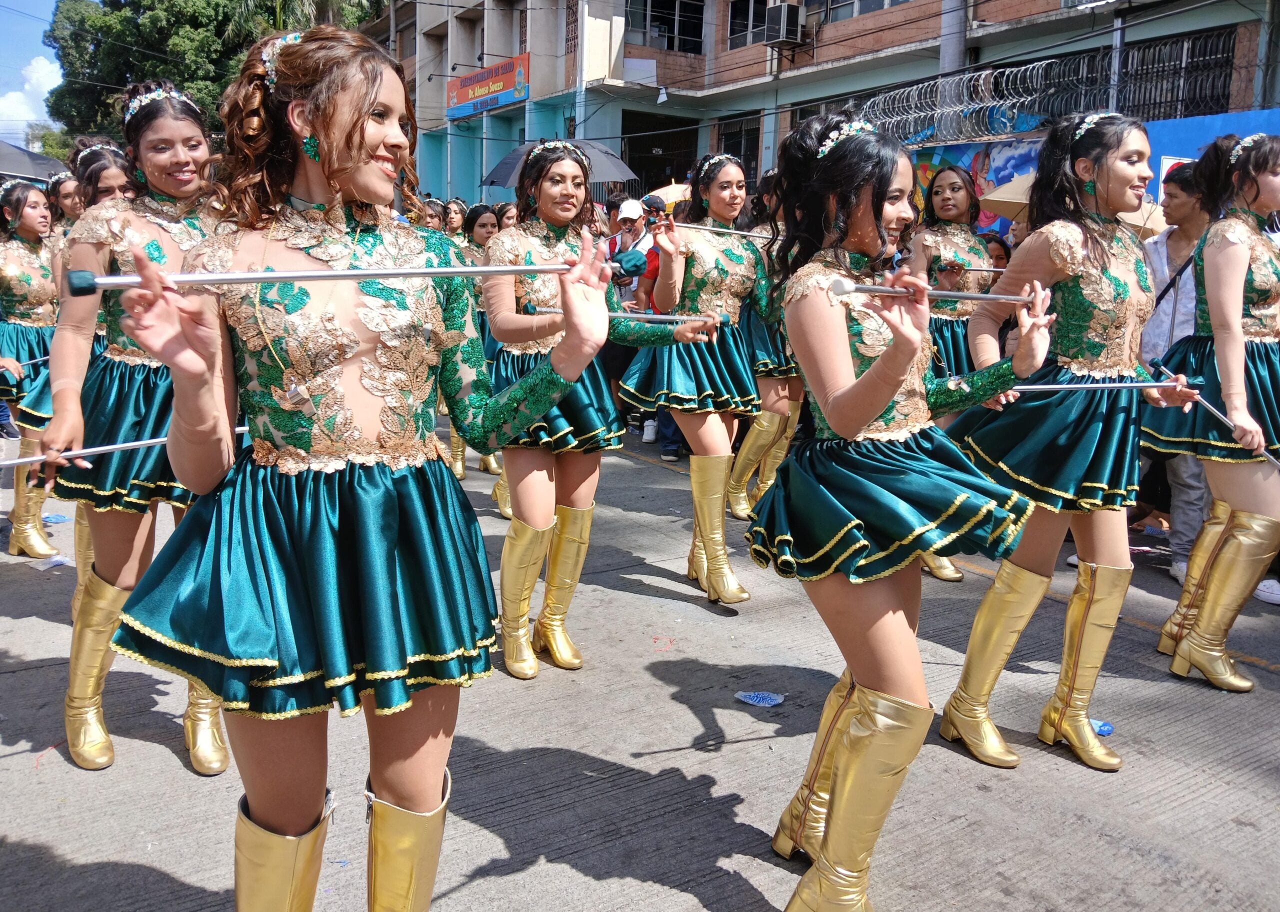 Las palillonas deslumbraron al público con sus atuendos verdes y detalles dorados, bailando al ritmo de su banda, conformada por estudiantes vestidos con un atuendo alusivo al del general Francisco Morazán.
