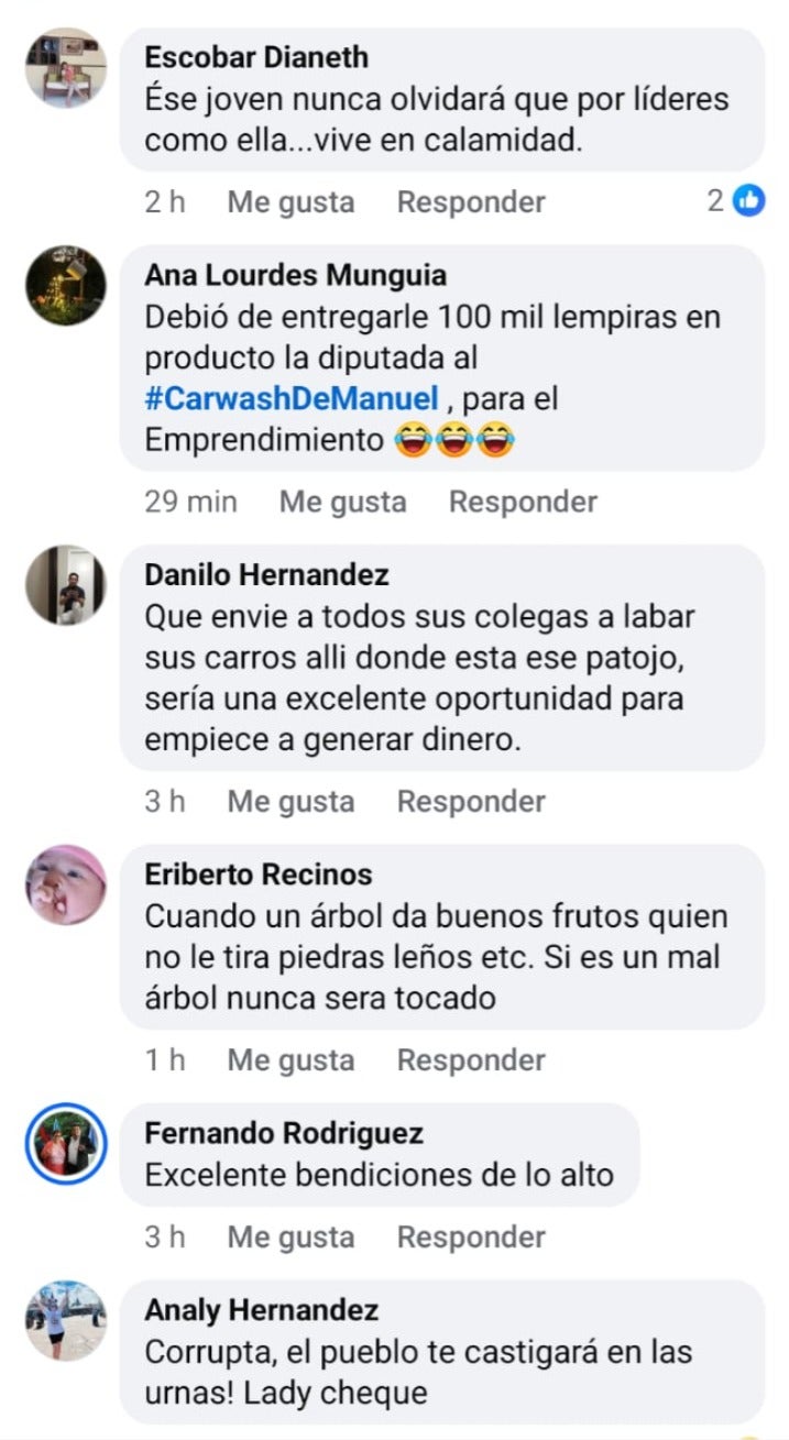 Redacción. La diputada por el departamento de Copán del partido Libre, Isis Cuellar, enfrenta una nueva avalancha de críticas luego de reaparecer y compartir una publicación en la que entregó equipo de limpieza y apoyo económico a un joven emprendedor de un carwash.