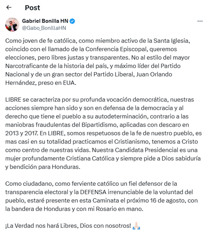 “Como joven de fe católica, como miembro activo de la Santa Iglesia, coincido con el llamado de la Conferencia Episcopal. Queremos elecciones libres, justas y transparentes, no al estilo del mayor narcotraficante de la historia del país, Juan Orlando Hernández”, manifestó.