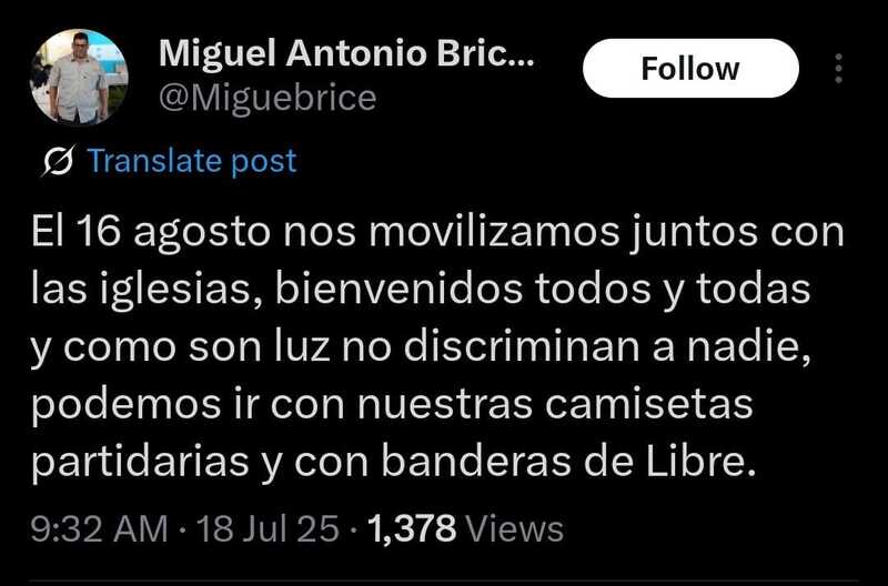 “El 16 de agosto nos movilizamos juntos con las iglesias, bienvenidos todos y todas. Y como son luz, no discriminan a nadie. Podemos ir con nuestras camisetas partidarias y con banderas de Libre”, expresó Briceño a través de sus redes sociales.